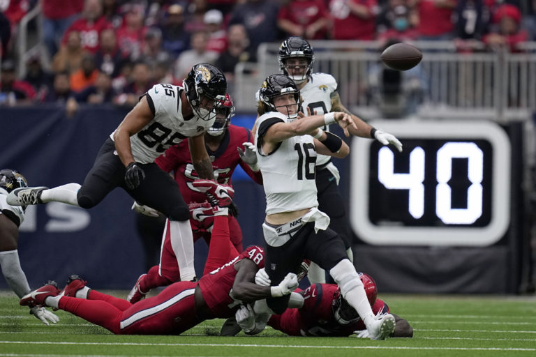 Rozohrávač Jacksonville Jaguars Trevor hodil neúplnú prihrávku počas prvého polčasu futbalového zápasu NFL v Houstone. Foto: SITA/AP.
