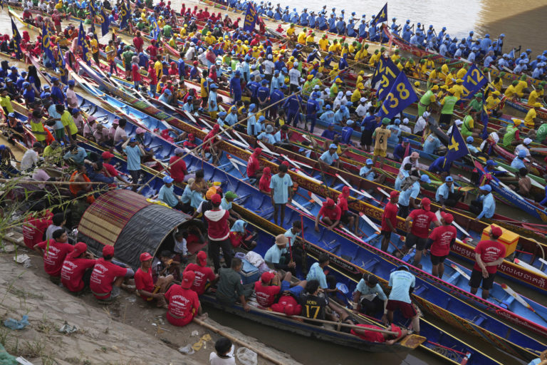 Kambodžskí veslári čakajú pri svojich člnoch na začiatok trojdňového vodného festivale v Phnom Penh v Kambodži. Pripomínajú si tak predkov - námorných bojovníkov. Foto: SITA/AP.