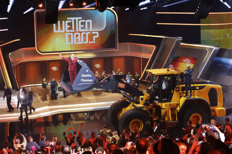 Moderátor Thomas Gottschalk prišiel na konci šou v ZDF "Wetten, dass...?" na pódium na lopate bagra, aby sa rozlúčil po 36 rokoch so svojou kariérou. Foto: Philipp von Ditfurth/dpa via AP.