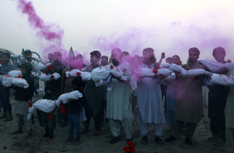 Pakistanskí aktivisti držia biele vaky postriekané fiktívnou krvou, aby vyjadrili solidaritu palestínskemu ľudu a upozornili na obete izraelského bombardovania v pásme Gazy. Foto: SITA/AP.