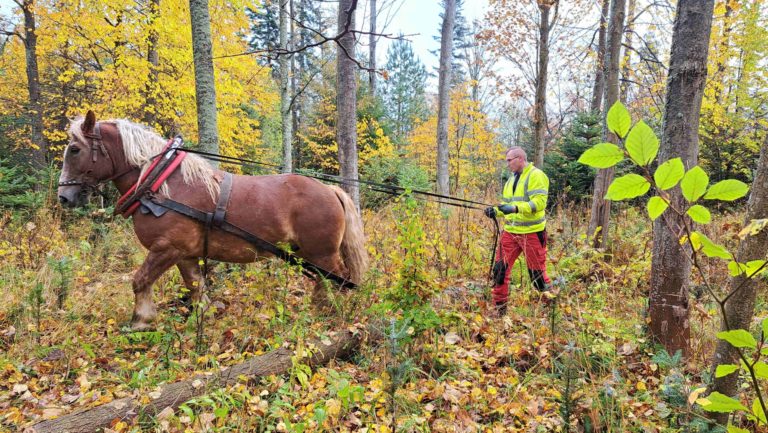 Lesný pracovník poháňa koňa pripraveného na odvoz dreva počas práce v lese na pozemkoch v obvode Fľak v Tatranskom národnom parku (TANAP). Spišská Belá, 26. október 2023. Foto: SITA/Mária Frisová.