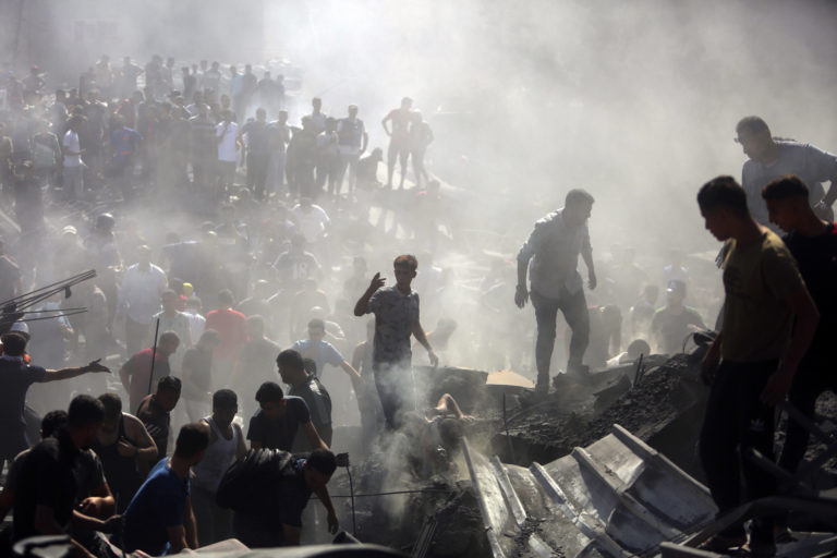 Palestínčania kontrolujú trosky zničených budov po izraelských náletoch na mesto Khan Younis v južnom pásme Gazy. Foto: SITA/AP.