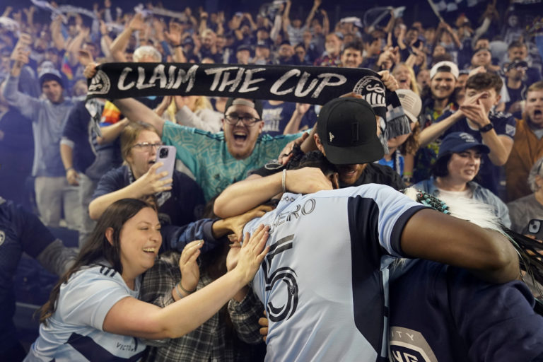 Fanúšikovia oslavujú s obrancom tímu Sporting Kansas City Danym Roserom víťazstvo po zápase play-off futbalovej MLS v Kansas City. Foto: SITA/AP.
