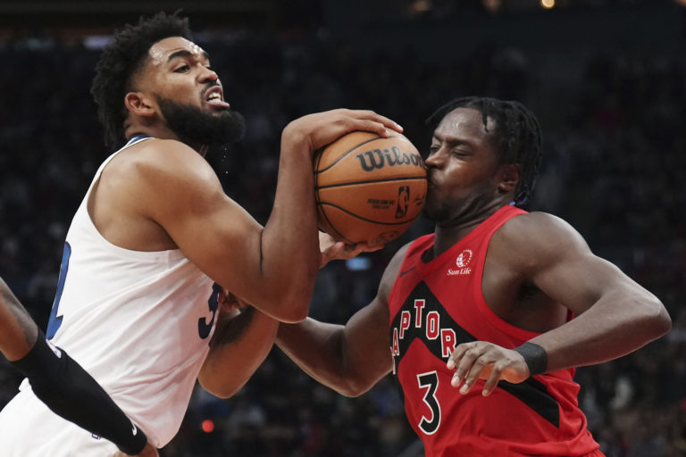Basketbalista Karl-Anthony Towns (32) z Minnesoty Timberwolves zasiahol loptou do tváre hráča Toronta Raptors' O.G. Anunobyho (3), keď sa pokúšal ísť ku košu počas druhého polčasu zápasu basketbalovej NBA v Toronte. Foto: Nathan Denette/The Canadian Press via AP.