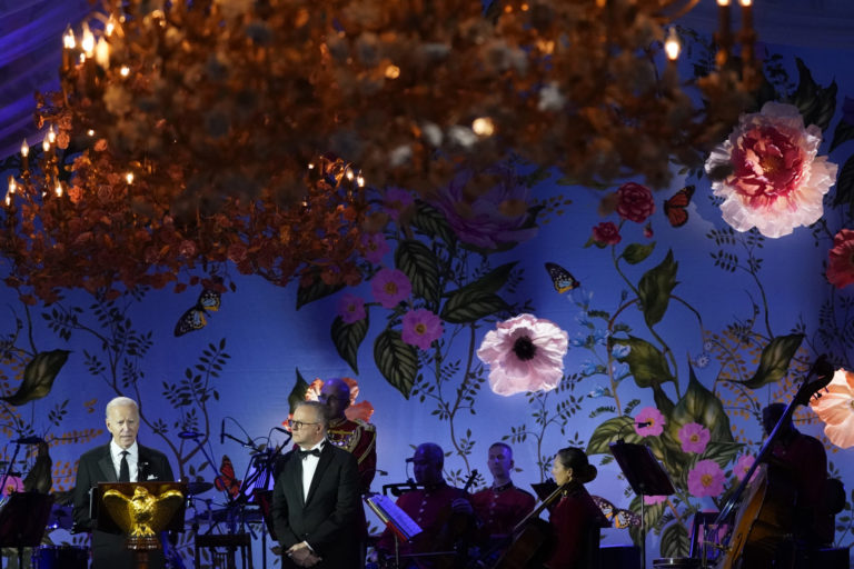 Americký prezident Joe Biden hovorí počas štátnej večere v Bielom dome, ktorá sa konala pri príležitosti návštevy austrálskeho premiéra Anthonyho Albaneseho. Foto: SITA/AP.