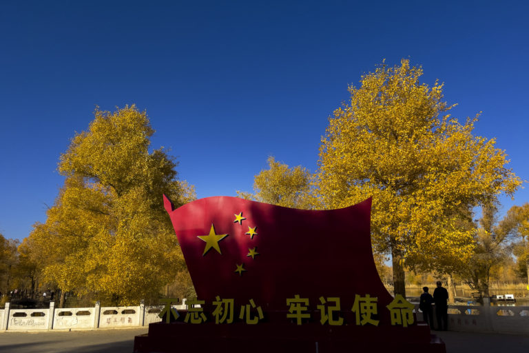 Turisti stoja pri čínskej národnej vlajke s propagandistickými slovami pri návšteve parku v čínskom okrese Jinta. Foto: SITA/AP.