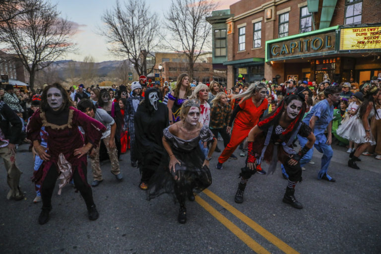 Ľudia v halloweenskych maskách tancujú na legendárnu pieseň Thriller od Michaela Jacksona v uliciach Eagle County. Foto: Chris Dillmann/Vail Daily via AP.
