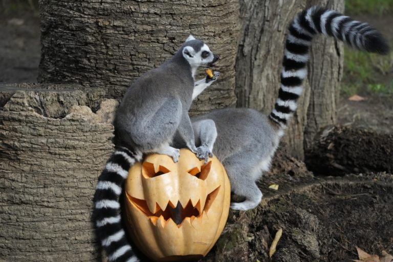 Lemur je potravu z tekvice v rímskej ZOO, ktorú mu pracovníci pripravili pri príležitosti blížiacich sa osláv Halloweenu. Foto: SITA/AP.