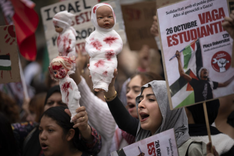 Študenti držia bábiky s obväzmi počas protestu v centre Barcelony. Vo viacerých španielskych mestách sa konajú zhromaždenia na podporu Palestínčanov, počas ktorých odsudzujú nedávne násilie na Blízkom východe. Foto: SITA/AP.
