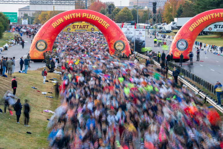 Bežci prechádzajú štartovacou čiarou počas 50. ročníka maratónu námornej pechoty v Arlingtone. Virgínia, 26. októbra 2025. Foto: (AP Photo/Allison Robbert