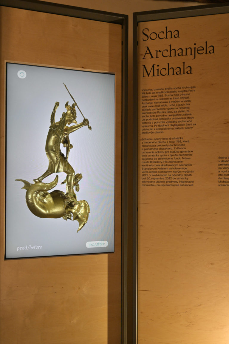 Interiér obnovenej Michalskej veže v Bratislave s vyobrazením obnovenej sochy sv. Michala Archanjela počas jej otvorenia. Bratislava, 26. september 2023. Foto: SITA/Milan Illík