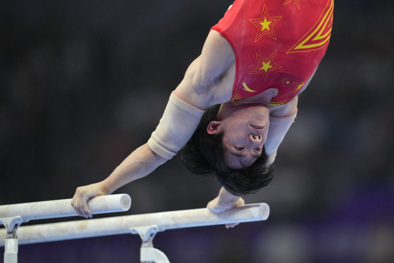 Zhang Boheng z Číny súťaží na bradlách na ázijských hrách v Hangzhou v Číne, utorok 26. septembra 2023. Foto: SITA/AP