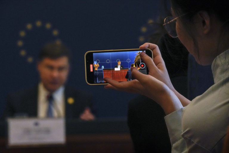 Reportér so smartfónom na natáčaní európskeho výkonného viceprezidenta a komisára pre hospodárstvo a obchod Valdisa Dombrovskisa v Číne, 26. septembra 2023. Foto: SITA/AP