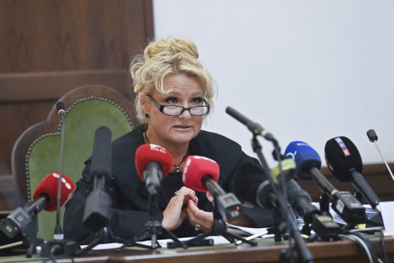 Sudkyňa Leona Némethová čítala verdikt pri smrteľnej zrážke vyhliadkovej lode Hableany v Pešti v Budapešti v utorok 26. septembra 2023. Foto: SITA/AP