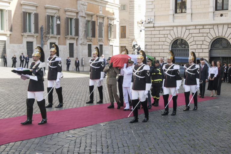 Nosiči nesú rakvu bývalého talianskeho prezidenta Giorgia Napolitana počas jeho pohrebu v Ríme v utorok 26. septembra 2023. Foto: SITA/AP