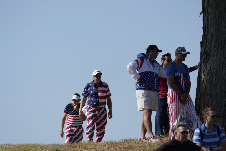 Fanúšikovia Spojených štátov amerických sledujú tréningové kolo pred Ryder Cupom v Taliansku, utorok 26. septembra 2023. Foto: SITA/AP