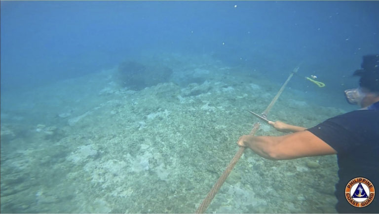 Potápač prerezáva lano priviazané k plávajúcej bariére v plytčine Scarborough na Filipínach, 26. septembra, 2023. Foto: SITA/AP