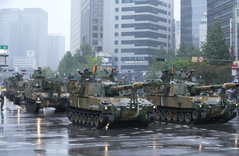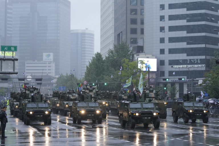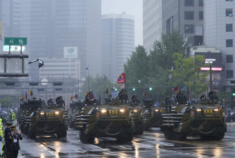 Obrnené vozidlá juhokórejskej námornej pechoty na prehliadke počas 75. slávnostného ceremoniálu v Soule, Južná Kórea, utorok 26. septembra 2023. Foto: SITA/AP