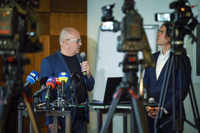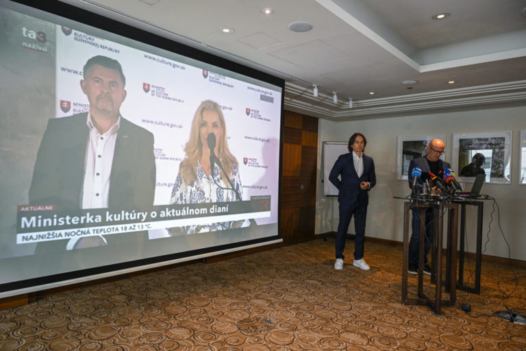 Sprava: Bývalý generálny riaditeľ Slovenského národného divadla (SND) Matej Drlička a bývalý ekonomický riaditeľ SND Matej Bošňák počas tlačového brífingu na tému: Reakcia na nedávne vyjadrenia Ministerstva kultúry SR a informácia o aktuálnom stave rekonštrukcie historickej budovy Slovenského národného divadla (SND). Bratislava, 27. august 2024. Foto: SITA/Milan Illík