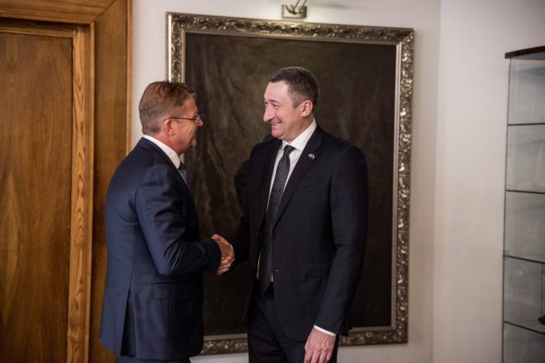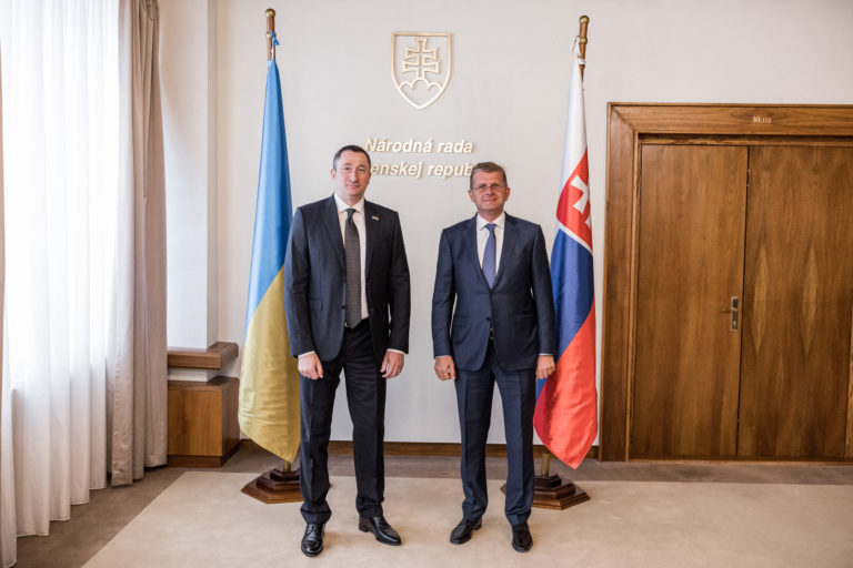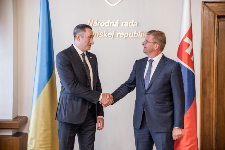 Zľava: Generálny riaditeľ ukrajinskej spoločnosti Naftogaz Oleksij Černyšov a podpredseda parlamentu, poverený výkonom právomocí predsedu Národnej rady SR Peter Žiga počas prijatia generálneho riaditeľa a delegácie ukrajinskej spoločnosti Naftogaz v Národnej rade SR, v rámci ktorého rokovali o plynulých dodávkach plynu a ropy. Bratislava, 27. august 2024. Foto: SITA/Kancelária Národnej rady SR