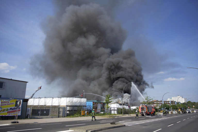 Hasiči počas požiaru nad skladom v nemeckom Hamburgu. Foto: Daniel Bockwoldt/dpa via AP