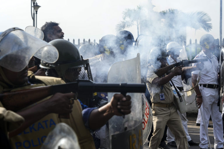 Polícia strieľa slzotvorný plyn, aby rozohnala demonštrantov proti znásilneniu a vražde lekára v štátnej nemocnici. Foto: SITA/AP