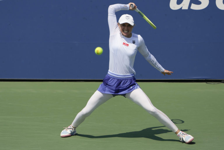 Bieloruska Aliaksandra Sasnovičová vracia úder Britke Katie Boulterovej počas prvého kola tenisového turnaja US Open. Foto: SITA/AP