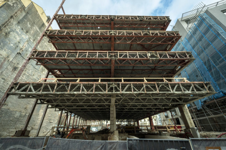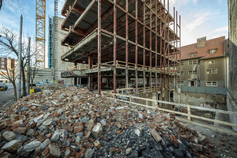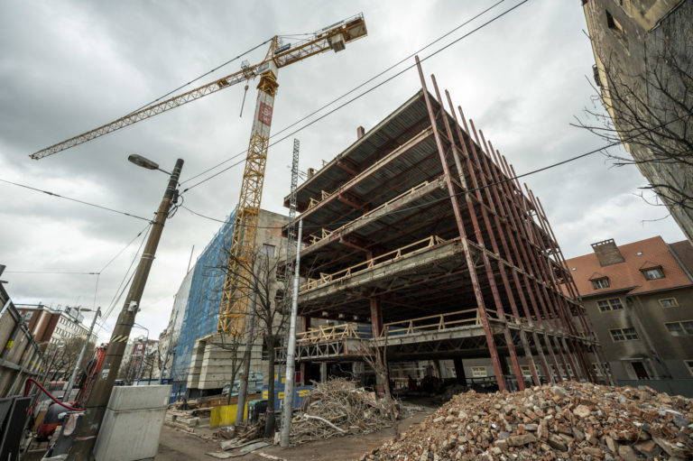 Dekonštrukčné a búracie práce v rámci obnovy Obchodného domu Dunaj v Bratislave. Bratislava, 22. december 2023. Foto: SITA/Milan Illík.