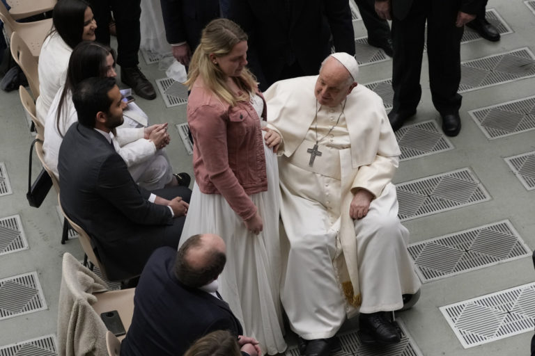 Pápež František požehnáva tehotnú ženu s jej dieťaťom počas generálnej audiencie v Aule Pavla VI. vo Vatikáne. Foto: SITA/AP.