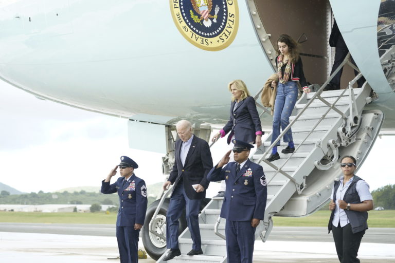 Americký prezident Joe Biden, prvá dáma Jill Bidenová a ich vnučka Natalie kráčajú po schodoch Air Force One po prílete na letisko Henryho E. Rohlsena v St. Croix, kde budú tráviť príchod nového roka. Foto: SITA/AP.