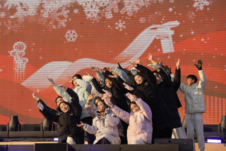 Účinkujúci majú skúšku pred novoročným odpočítavaním v Pekingu. Foto: SITA/AP.