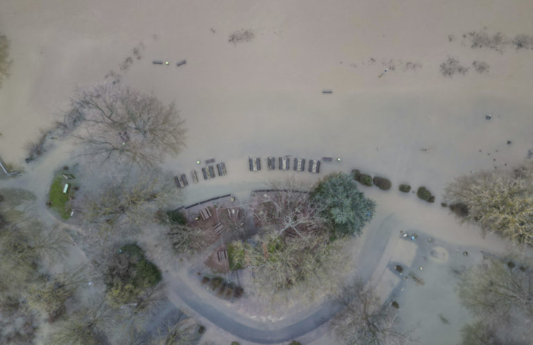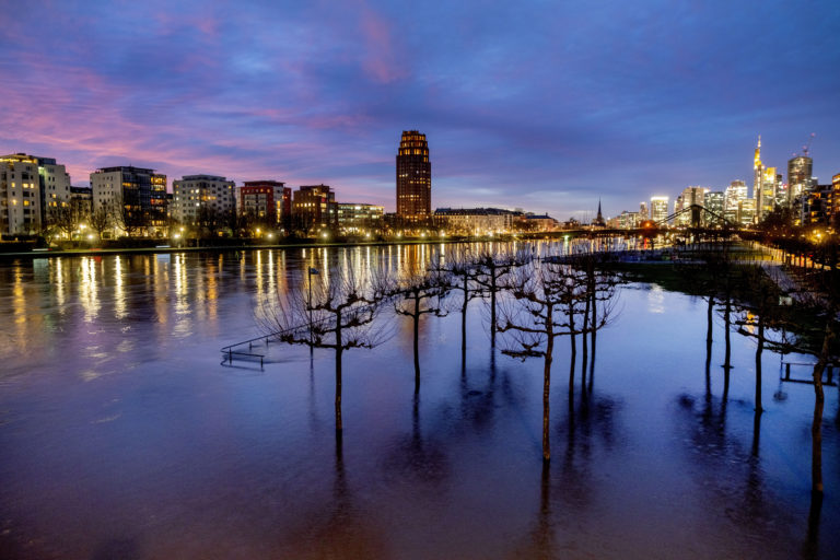 Stromy sú na zaplavenej lúke, čo spôsobil vytrvalý dážď a topiaci sa sneh pri na brehoch rieky Mohan v nemeckom Frankfurte nad Mohanom. Foto: SITA/AP.