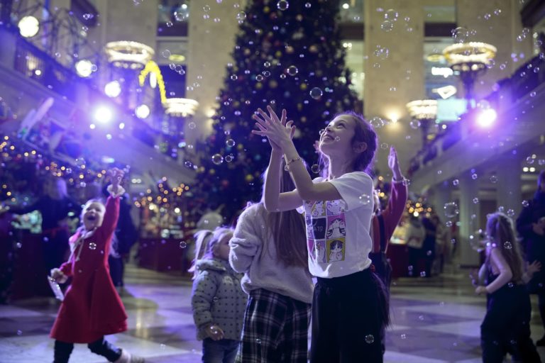 Deti sa hrajú s bublinami v Detskom obchode v ruskej Lubianke. Foto: SITA/AP.