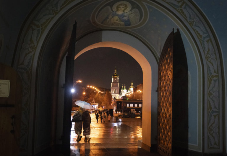 Ľudia vychádzajú z brány kláštora svätého Michala. V pozadí sa nachádza Katedrála svätej Sofie v Kyjive. Foto: SITA/AP.