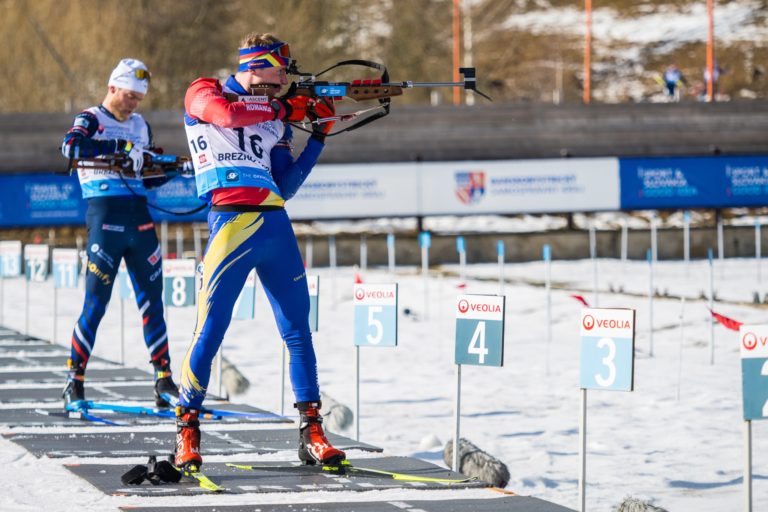 Rumunský biatlonista Dmitrij Šamajev (v popredí) počas stíhacích pretekov mužov na 12,5 km v rámci majstrovstiev Európy v biatlone 2024 v Osrblí. Brezno-Osrblie, 27. január 2024. Foto: SITA/Slovenský biatlon