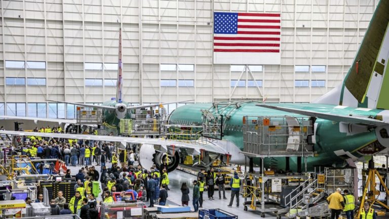Zamestnanci spoločnosti Boeing počúvajú Stana Deala, prezidenta a generálneho riaditeľa Boeing Commercial Airplanes a ďalších zamestnancov v Rentone. Foto: Boeing via AP