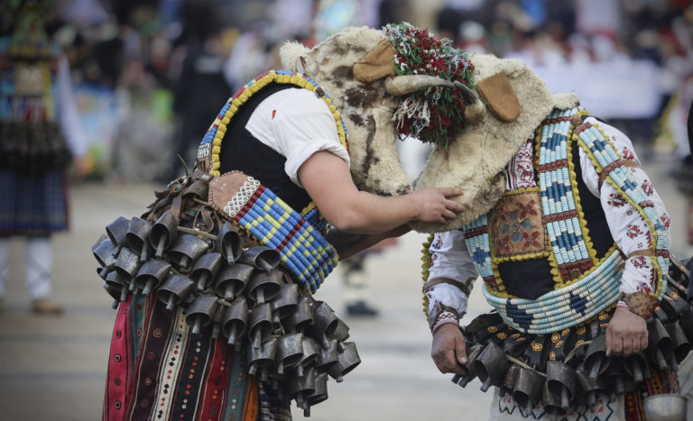 Bulharskí tanečníci v maskách na 30. medzinárodnom festivale maškarných hier "Surva" v meste Pernik v Bulharsku. Foto: SITA/AP