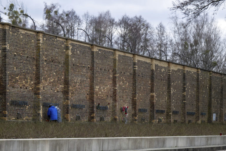 Ľudia navštevujú areál pamätníka Ravensbruck v nemeckom meste Furstenberg/Havel počas Medzinárodného dňa pamiatky obetí holokaustu. Foto: Monika Skolimowska/dpa via AP
