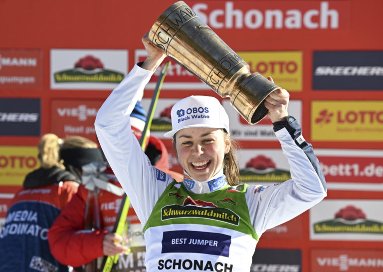 Nórka Mari Leinan Lundová vyhrala preteky Svetového pohára v severskej kombinácii žien v nemeckom Schonachu. Foto: Bernd Weisbrod/dpa via AP