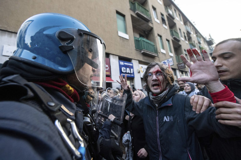Polícia s demonštrantmi počas zhromaždenia na podporu Palestínčanov v talianskom Miláne. Foto: Claudio Furlan/LaPresse via AP