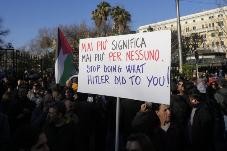 Demonštrant drží transparent počas demonštrácie na podporu Palestínčanov v Ríme. Foto: SITA/AP