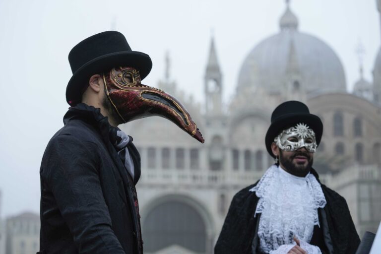 Muži v maskách pred kostolom svätého Marka počas otvorenej pouličnej prehliadky karnevalu v Benátkach v Taliansku. Foto: SITA/AP