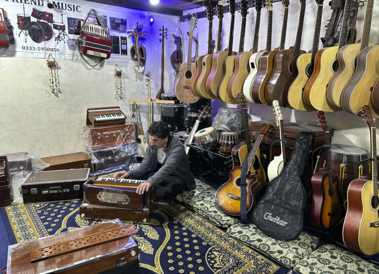 37-ročný Afganec Fazal Rahim Abid hrá na harmonium v obchode s hudobninami v pakistanskom meste Rawalpindi. Foto: SITA/AP