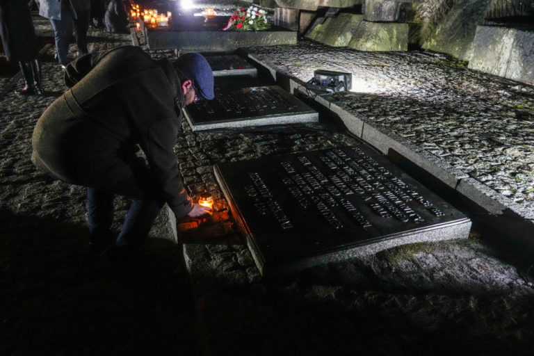 Muž kladie sviečku k pamätníku v nacistickom tábore smrti Birkenau počas ceremónie v poľskom Osvienčime. Foto: SITA/AP