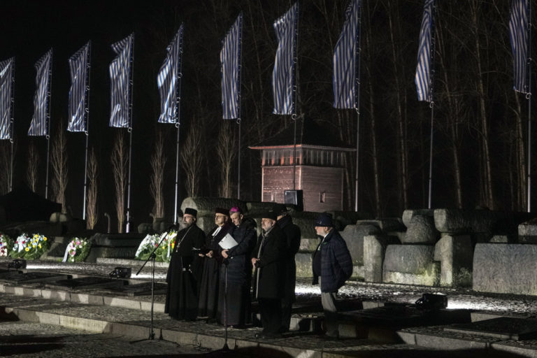 Duchovní prednášajú modlitby pri pamätníku v nacistickom tábore smrti Birkenau počas obradu v poľskom Osvienčime. Foto: SITA/AP