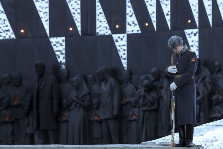 Ruský vojak čestnej stráže čaká na slávnostné otvorenie pamätného komplexu "Mierovým občanom Sovietskeho zväzu, ktorí zahynuli počas Veľkej vlasteneckej vojny", 2. svetovej vojny, pri obci Zajcevo v Leningradskej oblasti v Rusku. Foto: Anton Vaganov/Pool Photo via AP