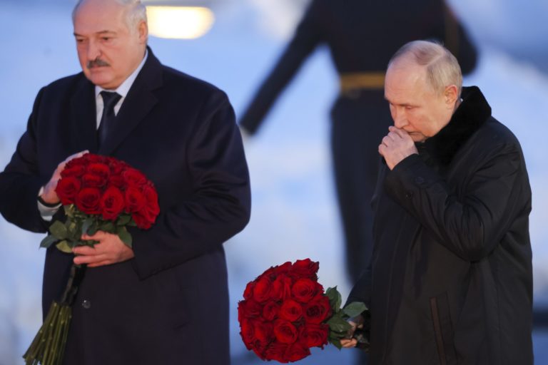 Ruský prezident Vladimir Putin (vpravo) a bieloruský prezident Alexander Lukašenko na slávnostnom otvorení pamätného komplexu "Mierovým občanom Sovietskeho zväzu, ktorí zahynuli počas Veľkej vlasteneckej vojny", druhej svetovej vojny, pri obci Zajcevo v Leningradskej oblasti v Rusku. Foto: Anton Vaganov/Pool Photo via AP