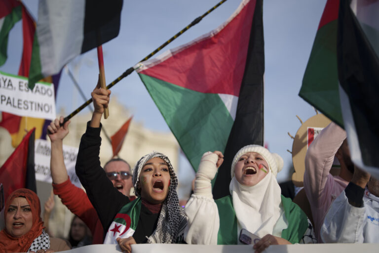 Ľudia počas protestu na podporu Palestínčanov vyzývajú na okamžité prímerie v Gaze v centre Madridu. Foto: SITA/AP