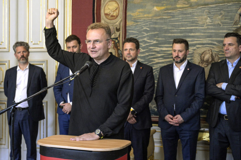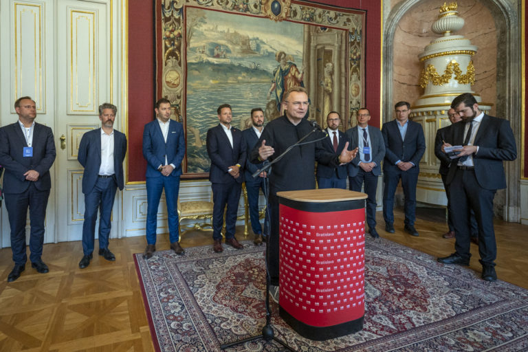 Zástupca za ukrajinské mestá primátor Ľvova Andriy Sadovyi (uprostred v popredí) počas tlačového vyhlásenie primátorov európskych miest v rámci summitu Pakt slobodných miest v Primaciálnom paláci v Bratislave. Bratislava, 27. máj 2024. Foto: SITA/Milan Illík