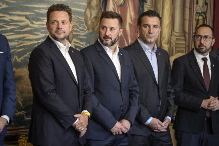 Zľava: Jeden zo zakladajúcich členov Paktu slobodných miest a primátor Varšavy Rafal Trzaskowski a primátor Bratislavy Matúš Valo počas tlačového vyhlásenie primátorov európskych miest v rámci summitu Pakt slobodných miest v Primaciálnom paláci v Bratislave. Bratislava, 27. máj 2024. Foto: SITA/Milan Illík